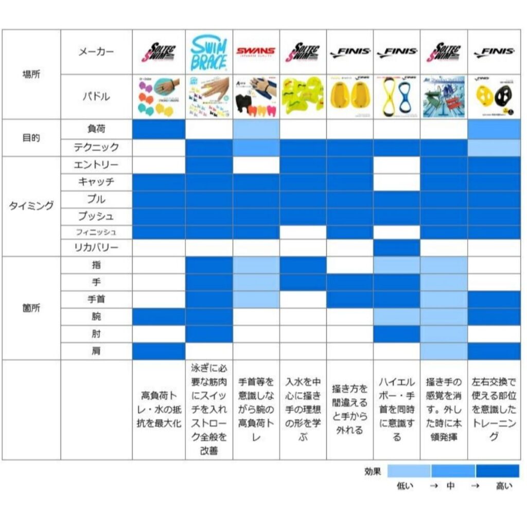 近年の練習用具には上記のように負荷をただ大きくするものだけではなくなりました。水流に違和感を持たせることでフォームの改善を促すものや、むしろ特定部位(例えば手)の負荷を減らすことで特定部位(例えば腕)を徹底して練習させるもの、筋活動にスイッチを入れてそもそも力の入れ方から泳ぎを変えるものなどが増え、多様化しています。この辺りの説明は最後に追記します。